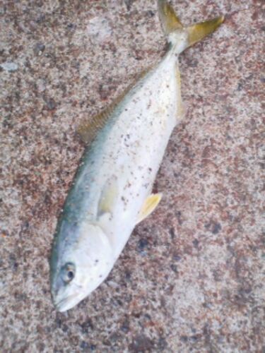 梅雨に入り天気が安定しない小名浜港。 朝、晴れていたのでT字へ。 様子見だけにしようと思っていたら、水面に生命感。 小さい小さいワカシ発見。 軽量タックル、JH0.8gで。 しばらく消えてしまっていたが、着水点にもやもや。 10尾ほど追って来た。 足元で…