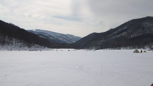 20190303 ひな祭り 秋元湖が2月中に終了してしまったので、桧原湖へ。 暖かい日が続き、道路に雪なし。 湖の氷の上にも雪なし。 ツルツルではなく、歩きやすい。 目印で囲まれた所に、空気穴! 泡がポコポコ出ていた。 タックルは、自作電動2丁。 穂先はK-ZA…